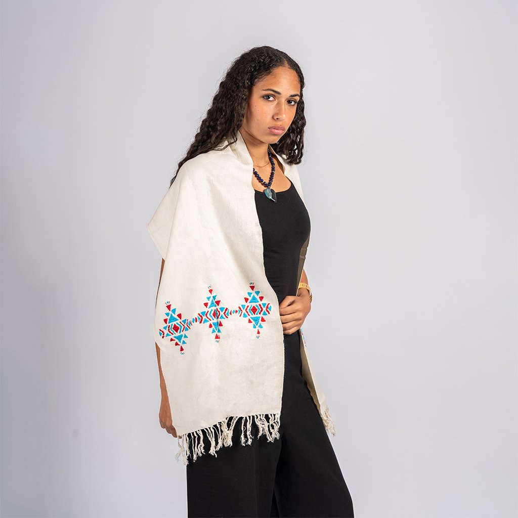 شال فاخر من نسيج أخميم اليدوي بلون أبيض نقي، مزين بتطريز يدويا بوحدات هندسية ملونة. قطعة تراثية ناعمة تمنحك إطلالة مشرقة، ونمشي بها “سوا”.