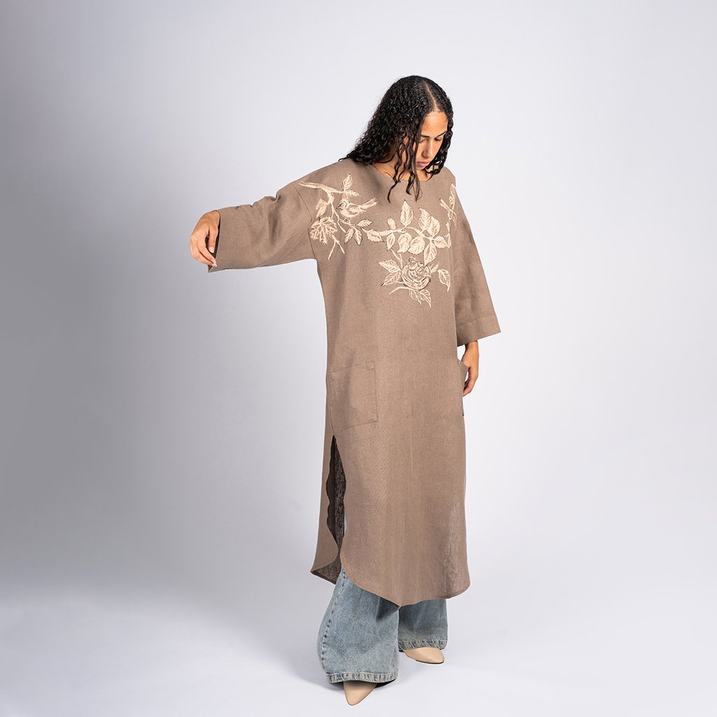 كافتان من الكتان الطبيعى، مرسوم يدوياً بتقنية الكلور. قطعة هادئة تحمل أثراً من رحلة تعلم وعمل وضعته السيدة فى كل غرزة… قطعة خفيفة ترافقك، ونمشى بها سوا.