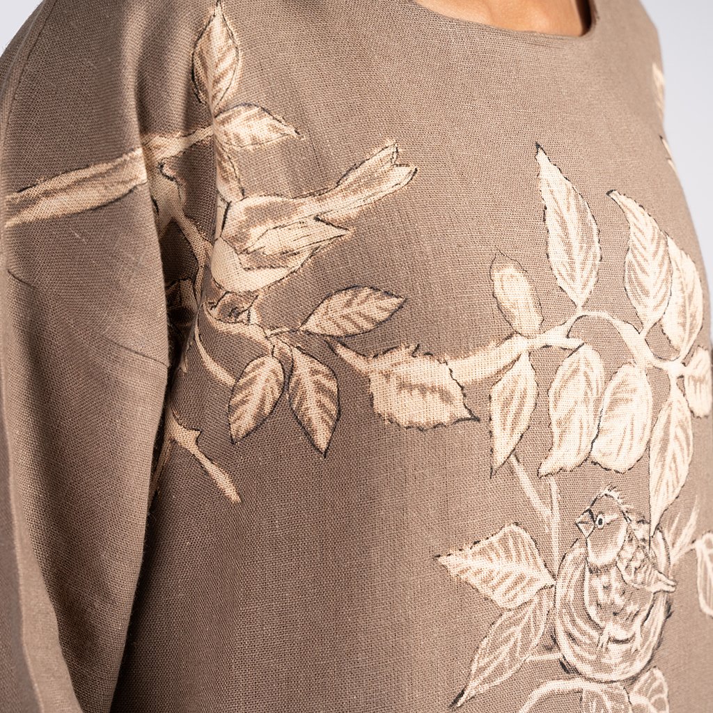 صمم هذا الكافتان ليكون رفيقكِ في الأيام التي تبحثين فيها عن الهدوء والتميز. بخامة كتان طبيعية 100% وقصة فضفاضة تضمن لكِ حرية الحركة، تبرز هذه القطعة كنموذج للاعتمادية والأناقة البسيطة. الرسوم اليدوية للعصافير والأغصان ترمز للانطلاق، ونفذتها سيدات “سوا” بتقنية الكلور لتكون جزءاً لا يتجزأ من نسيج القماش. ارتداؤك لهذه القطعة هو تقدير للفن اليدوي ودعم حقيقي لسيدات اخترن الإبداع طريقاً لتجاوز التحديات الصعبة.