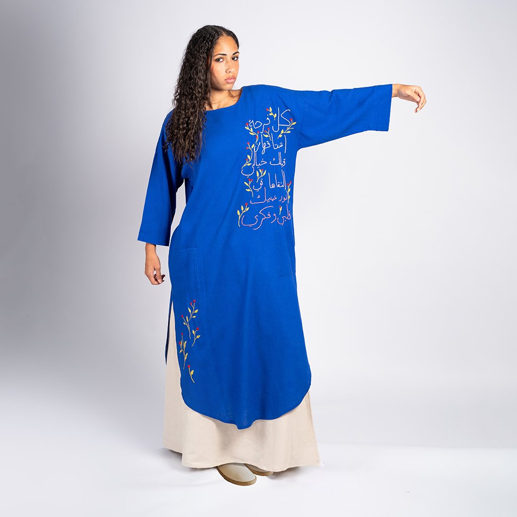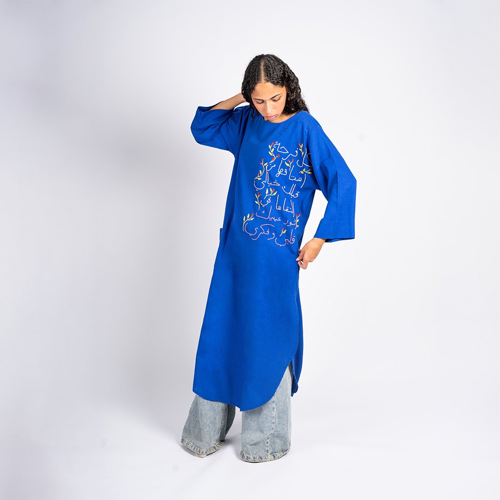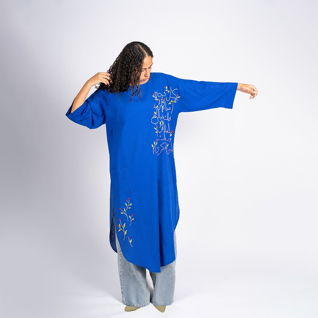 بدأ هذا الكافتان بخامة كتان طبيعي باللون الأزرق الزاهي، ليكون مساحة للتعبير عن الإبداع و**المرونة**. تتزين الواجهة بتطريز يدوي متقن يحمل كلمات من القلب، محاطة بزهور رقيقة تعكس **قوة المرأة** وقدرتها على تحويل الخيوط إلى رسائل ملهمة. كل غرزة في هذا التطريز هي نتاج عمل تشاركي جمع بين مهارة سيدات الجيزة وبني سويف، ليجسد معنى **”سوا”** في أبهى صوره. التصميم يتميز بقصة فضفاضة تمنحكِ **الحرية** في الحركة دون تكلف، مما يجعله قطعة فريدة تزيد من ثقتك بنفسك وتجعلكِ شريكة في رحلة تمكين مستمرة.